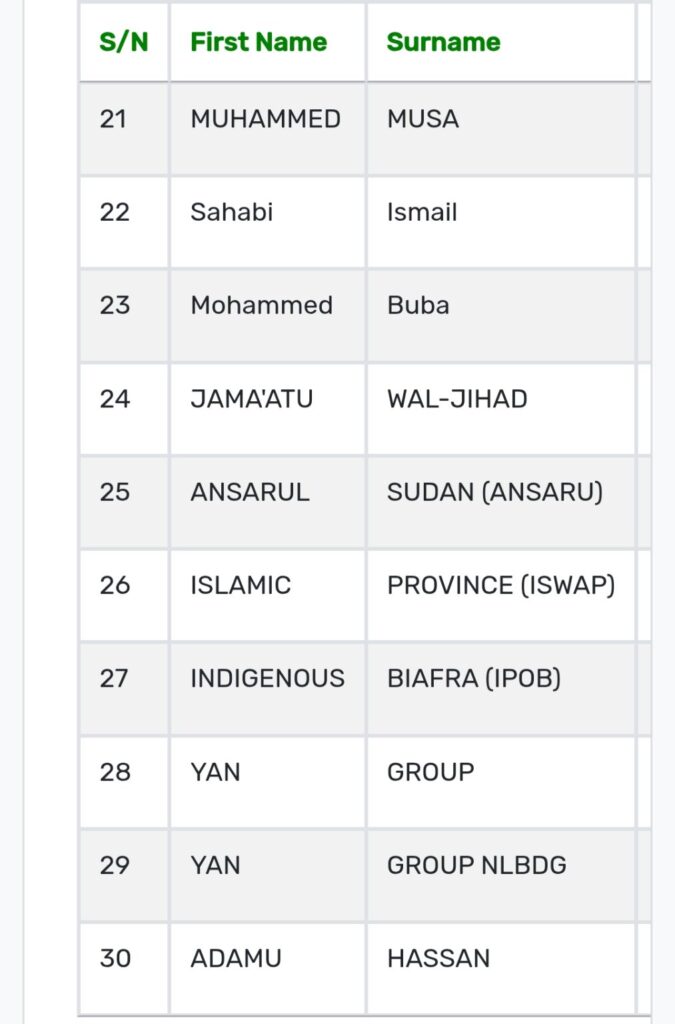 According to the publication, those named are suspected of involvement in financing and supporting terrorism-related operations. The list includes individuals and organisations reportedly connected to groups such as the Indigenous People of Biafra (IPOB), Ansaru, and the Islamic State West Africa Province (ISWAP).
